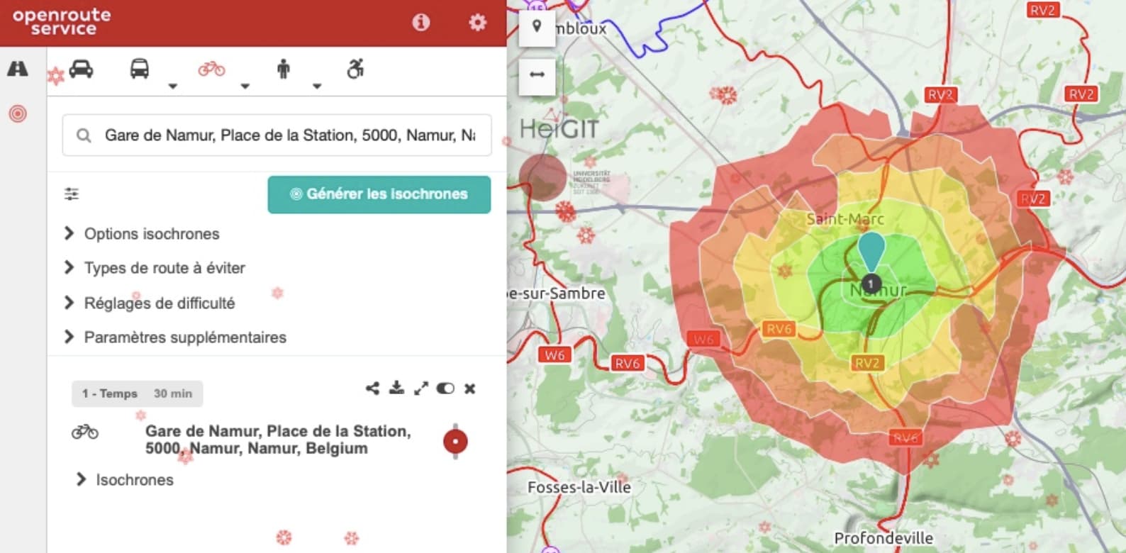 Le HeiGIT (Heidelberg Institute for Geoinformation Technology), un institut de recherche allemand, a développé un outil de création de cartes isochrones très précis nommé OpenRouteService.